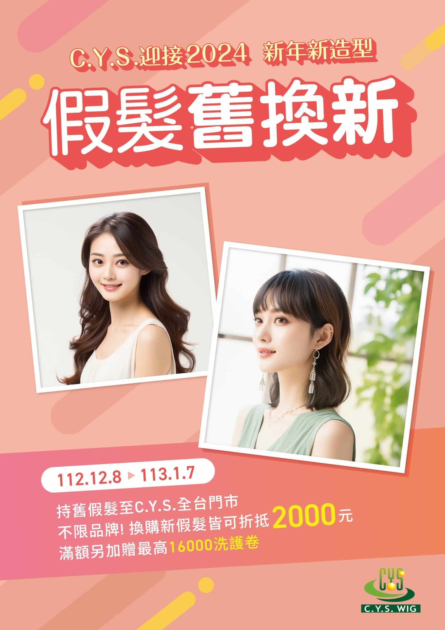 新品上市:C.Y.S.輕旅行假髮 2024/07/07 活動時間 : 請參詳活動內容頁 C.Y.S. Cooltrip 輕旅行假髮,輕薄好攜帶,帶來極致舒適的佩戴體驗!採用涼感及抗菌防臭網帽,讓輕旅行假髮既舒適又衛生,陪伴您輕鬆走遍各地,一起去旅行✈️